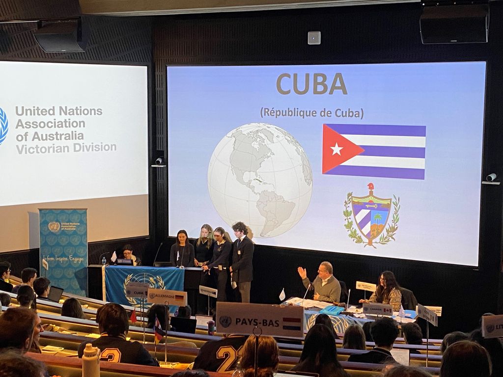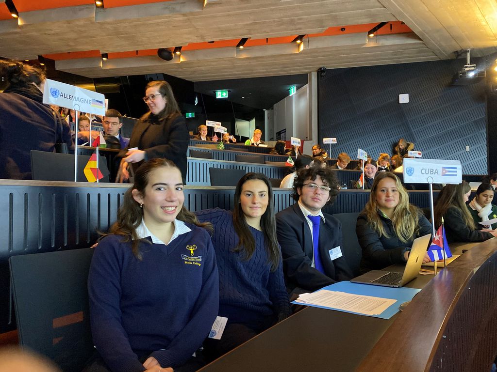 On Thursday 20 July three Year 11 students, Rebecca P, Hannah M and Nathan H, plus French exchange student, Léonie P, participated in a French Model UN Conference, a creative simulation of the UN General Assembly. Bialik students represented the interests of Cuba. It was a fantastic opportunity for them not only to learn about the UN system and to discuss the issue of climate change and the impact it has on different countries but it also enabled them to practice their negotiation and public speaking skills, all in French!