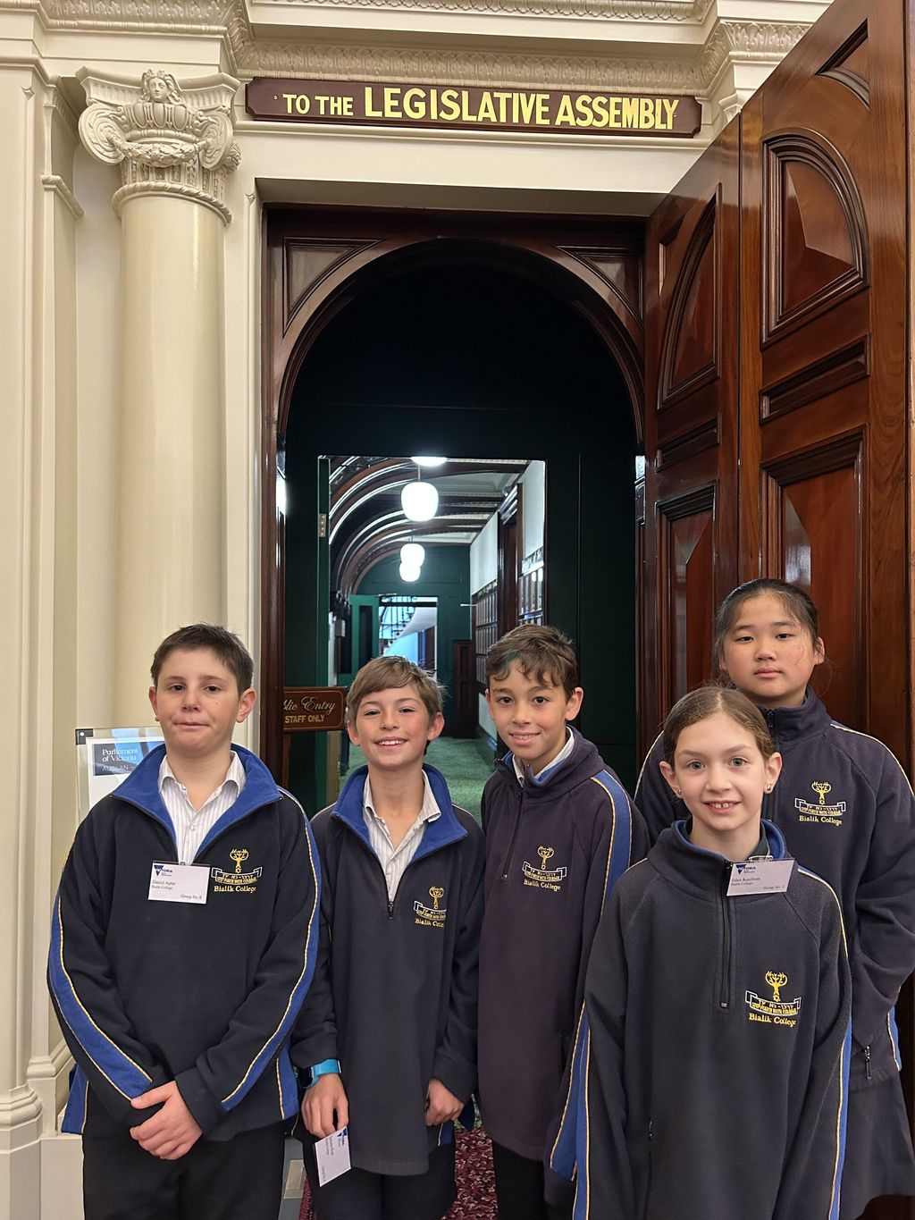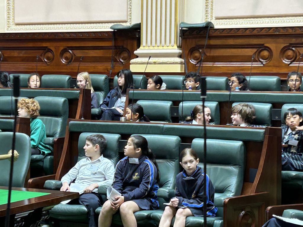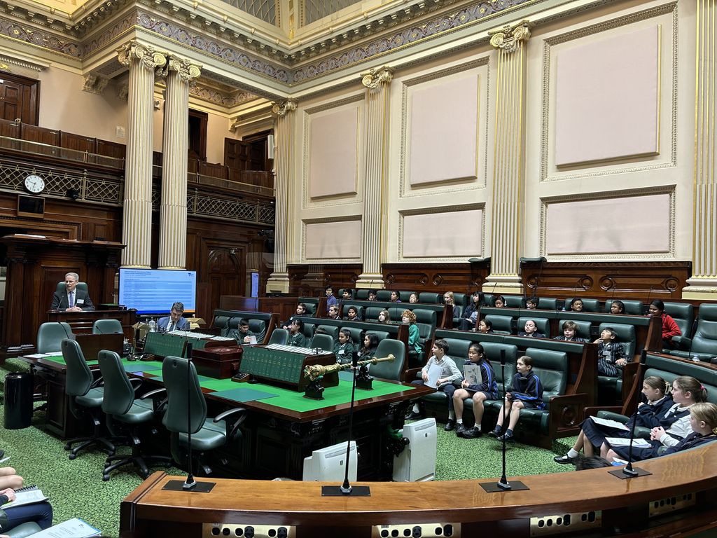 On Tuesday 6 June, five students from Year 5 represented Bialik at the 2023 Primary Schools’ Parliamentary Convention joining over 70 other school students. The topic of the day was, “Should the age of criminal responsibility be increased from 10 years of age?” The day was held at Parliament House, Melbourne, with all proceedings taking place within the Legislative Assembly. The day began with a Welcome to Country delivered by Wurundjeri Elder Bill Nicholson and a welcome to attendees delivered by Ken Macpherson, Chief of Staff to the Attorney General of Victoria, Jaclyn Symes MLC. Ken spoke to us about his and the Attorney General’s roles and shared the background and complexities involved in the topic of the day, explaining that it will also be discussed and debated in parliament later this year.